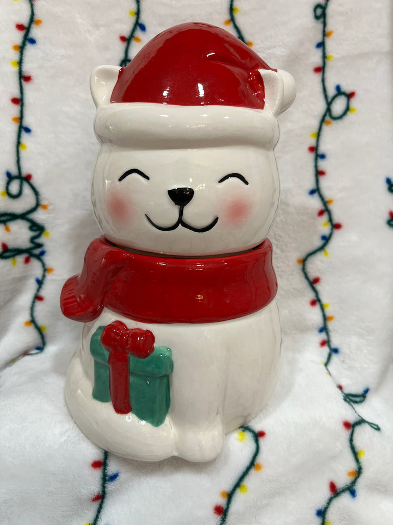White Cat w/ Santa Hat, Scarf & Present Cookie Jar