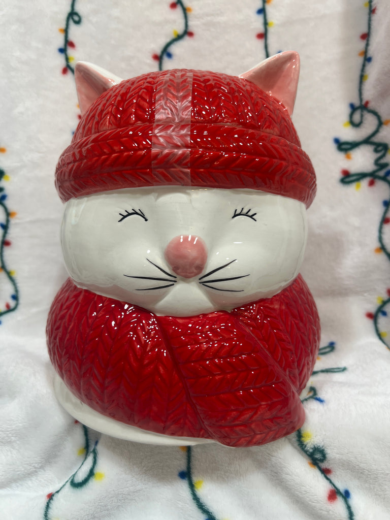 White Cat Cookie Jar w/ Red Hat & Scarf