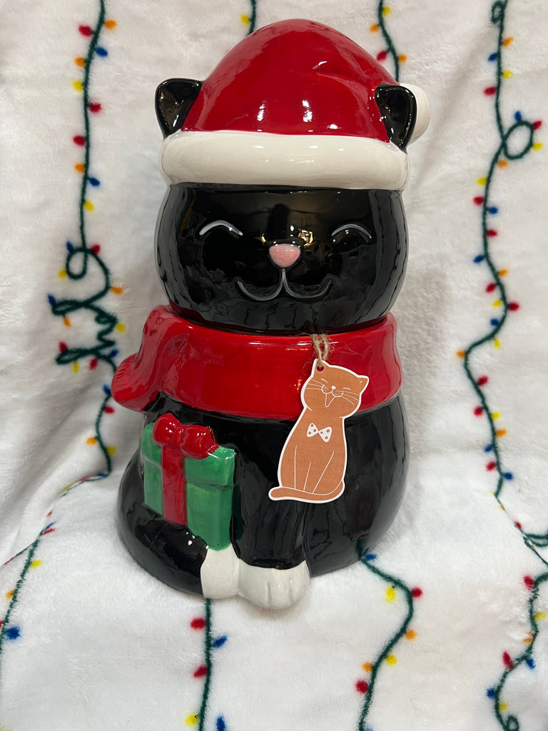 Black Cat w/ Santa Hat, Scarf & Present Cookie Jar